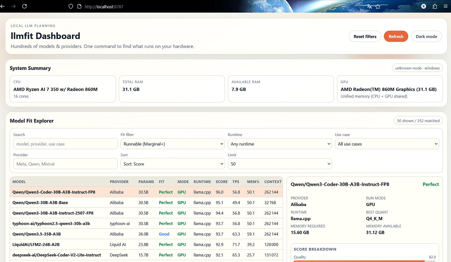 If you are not at your ease with the TUI, don’t worry! Lllmfit got your back with a web interface! By default, it will automatically open at http://localhost:8787.