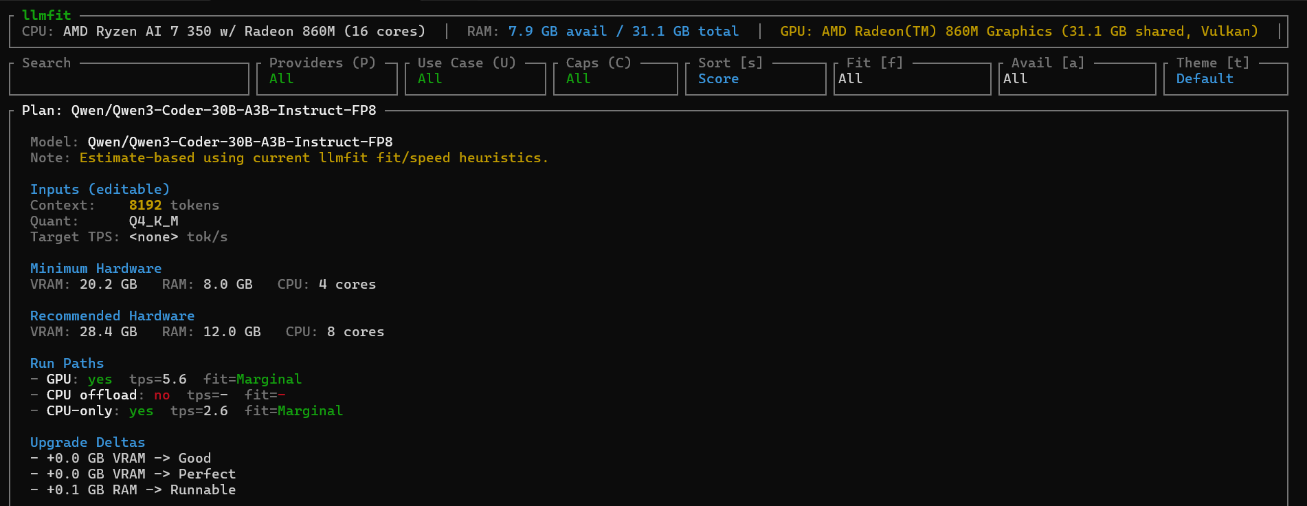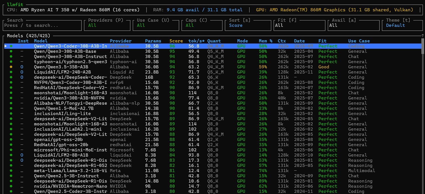 $ llmfitThis is what I got on my Windows. You can filter models by provider, fit score, etc… For more information about the navigation, read this section of the documentation.
